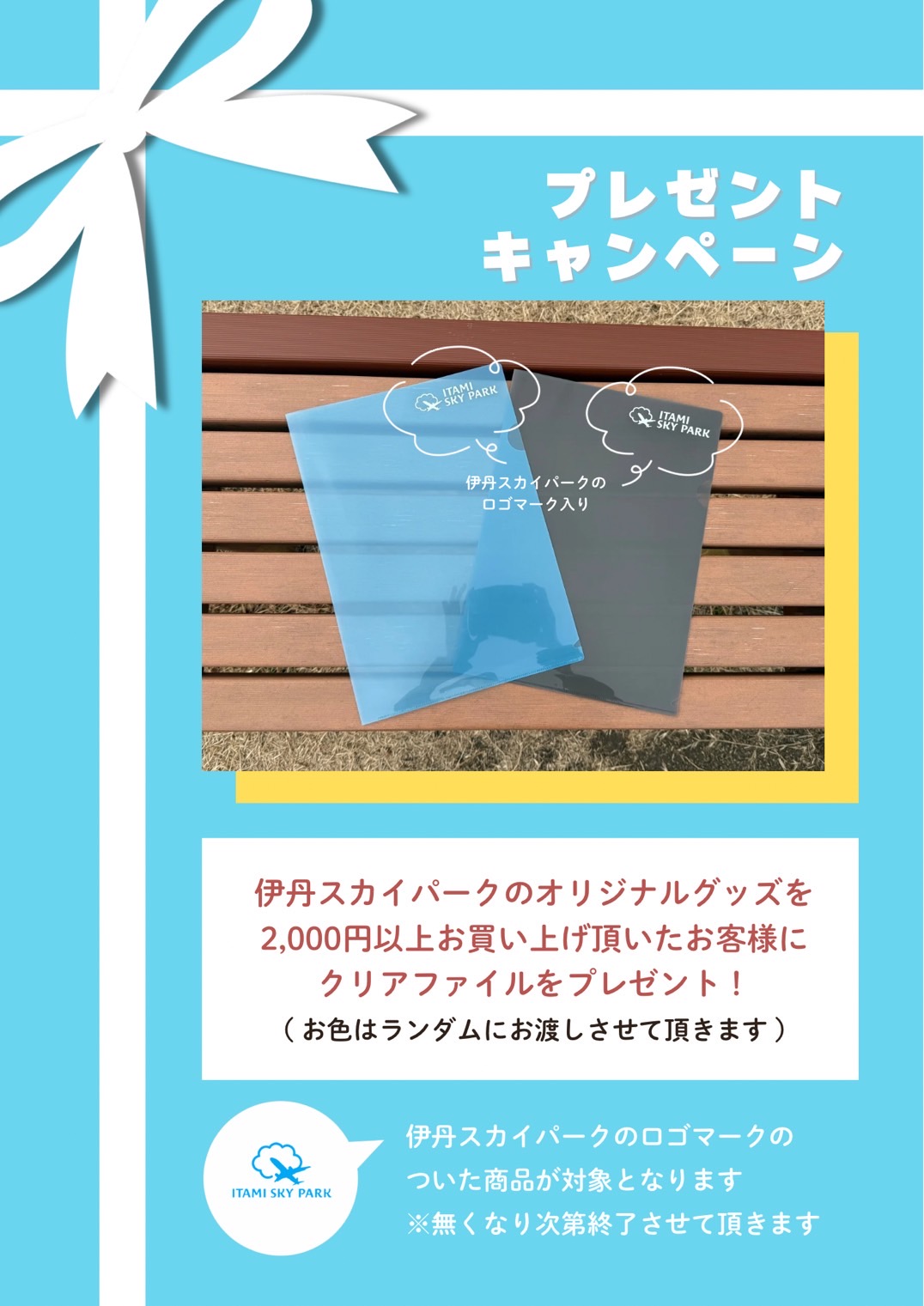 スカイパークのオリジナルグッズを2,000円以上お買い上げ頂いた方に、クリアファイルプレゼント中です♪