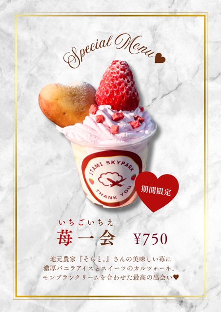 2026.02.21 3月限定ソフト!苺一会(いちごいちえ)🍦 苺一会(いちごいちえ)🍦 3月限定のソフトクリームは、いちごとモンブランクリームを合わせたソフトクリームです🍦 近隣農家「そらと。」さんのいちごを使用しております🍓 見た目も可愛く、美味しいですよ♪ぜひご賞味くださいませ。 販売日時 3月毎日 販売場所 中央スカイフードショップ 料金 🍦750円(税込み) 他にもたくさんメニューございます🍕 詳しくはこちら